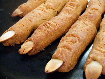 Using a toothpick or a fork tine, draw on knuckle lines. On the end of each tube, add the almond, pointy side up so that it looks like a finger nail. Arrange the fingers on a baking sheet, sprinkle with salt and pepper and bake for 20 minutes or until they start to turn golden brown. Remove from oven and let cool. Be careful when you’re eating these – keep track of whose fingers you’re chewing on.