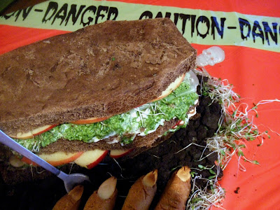 To make the grass and the “dirt” for the coffin, add a layer of Alfalfa sprouts onto a platter. Crumble the chocolate cookies and place them on a platter. Arrange the coffin sandwiches on top of the “dirt.” Stick a small spoon in the dirt to act as a shovel. Your guests will really dig this dish!