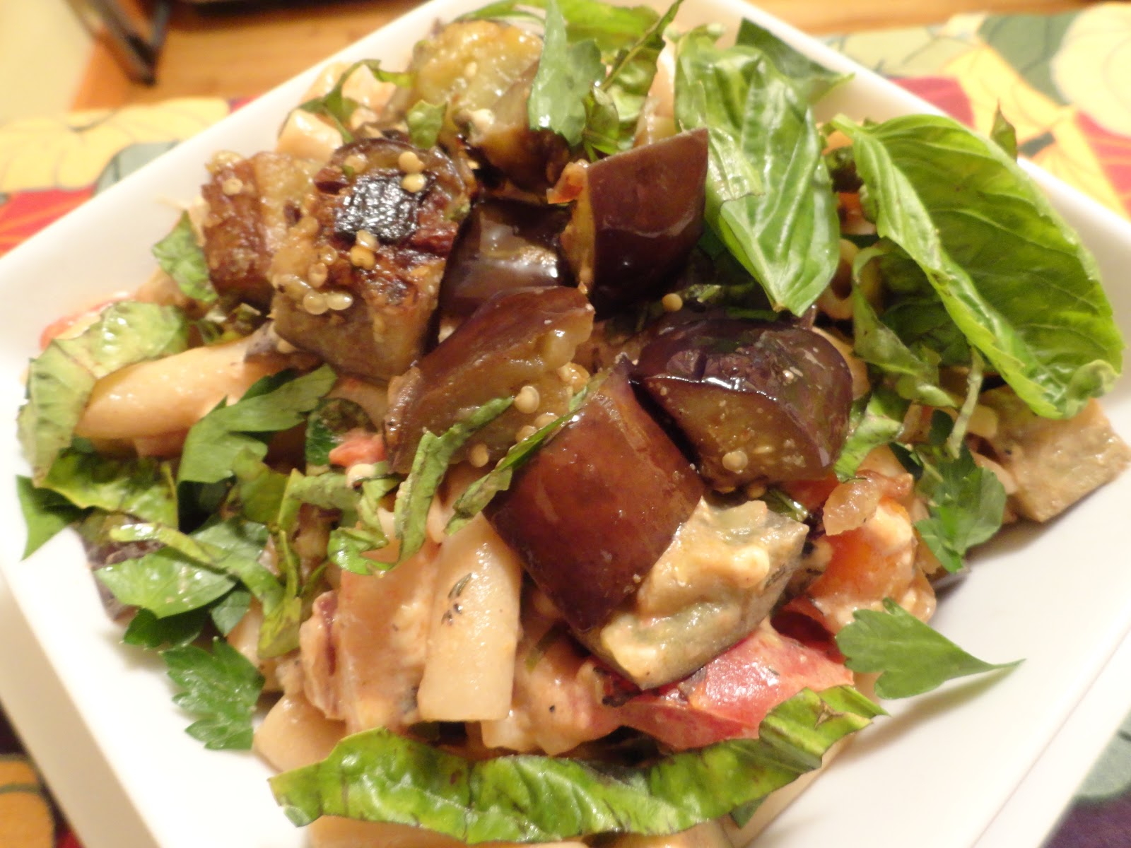 The eggplant is soft and tender, the sauce is creamy and indulgent and the whole dish tastes fresh and satisfying. It doesn’t take long to make and it’s a definite crowd-pleaser. As Sandra Lee says, “Keep it simple. Keep it sweet. Keep it smart.” As I say, “Keep it vegan and enjoy!”