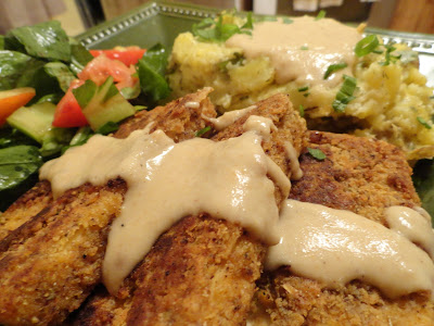 “Chicken-Fried” Tofu Steak with Creamy Mashed Potatoes and White Gravy