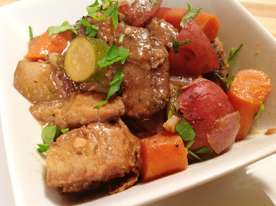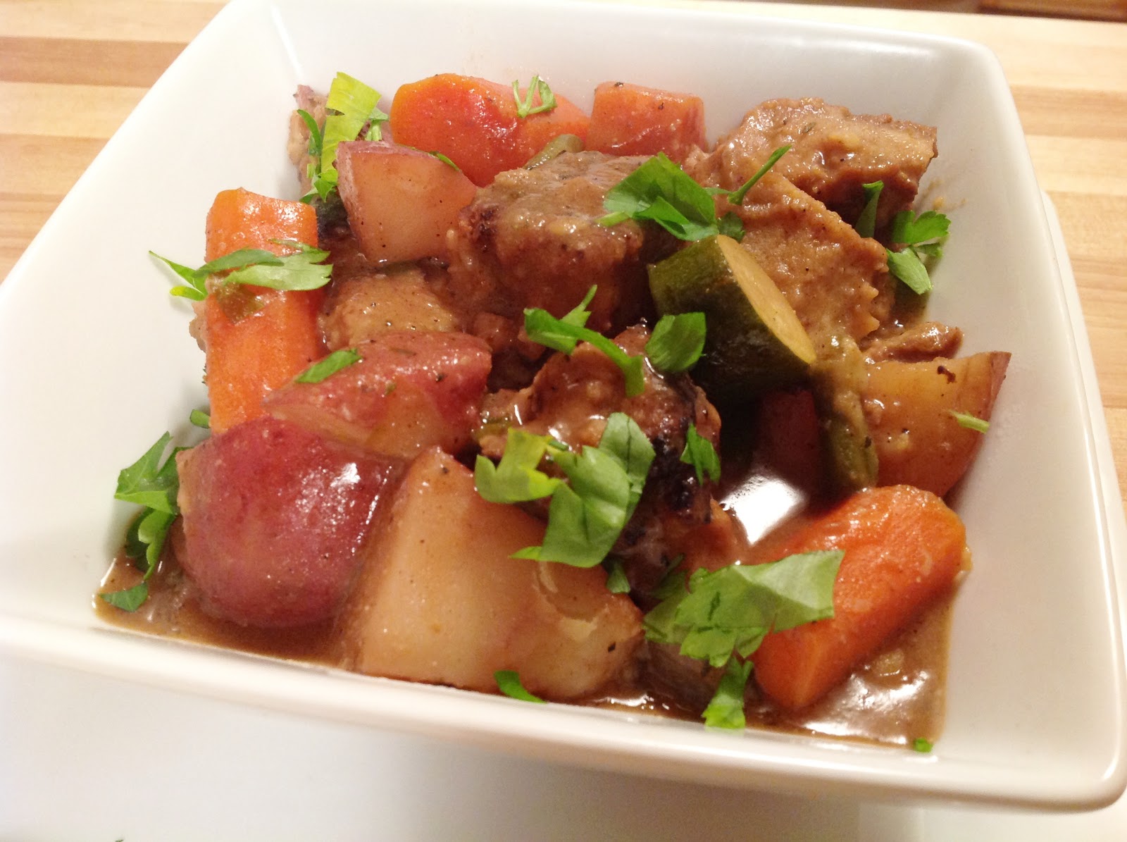 Return the seitan chunks (if you haven’t eaten them all) to the pot and mix them in with the vegetables. Clearing a spot in the liquid, mix in 3 Tbs. of flour. This will thicken the sauce. Add the Worcestershire sauce and mustard and mix well. Let cook until the sauce thickens, about 5 minutes. Add salt and pepper to taste. Serve in a bowl garnished with fresh parsley.
