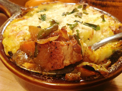 Then there is the topping. I like the mashed potato topping of Shepherd’s Pies better than the dough topping of pot pies. So behold my creation: a Shepherd’s Pot Pie. It has the chunkier filling I like with the mashed potato topping I love.