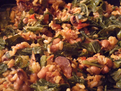 According to tradition, Hoppin’ John should be the first thing one eats on New Year’s Day to ensure maximum good luck. When the clock strikes midnight, families toast each other with champagne and a bowl of Hoppin’ John. If the dish is served with collard greens, mustard greens, turnip greens, chard or kale, it adds the promise of wealth since these delicious, nutritious greens are the color of money. Wow, a kiss, luck and money – sounds like a midnight trifecta to me!