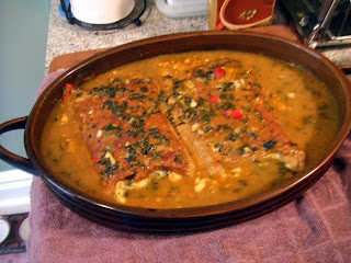 Place a layer of vegan cheese on the seitan, then add the spinach stuffing in a thin layer. Roll the seitan, trying to keep all the stuffing inside, as tightly as you can. Lay the rolled seitan in a casserole dish, seam side down. Fill casserole dish with the broth.