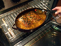 Bake for about 45 min. to an hour, basting the seitan roast often, until it looks brown and yummy and the cheese is all gooey. Carefully remove the roast from the broth-filled casserole dish and let rest for about 10 minutes before slicing.