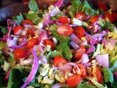Chop lettuce, add celery, onions and tomatoes. I don’t make formal salad dressings. I just add Kosher or sea salt, pepper, garlic powder and dried (or fresh if I have) parsley to the salad. Then I pour about 3 Tbs. of balsamic vinegar and 2 Tbs. safflower oil on top and toss well. I know salad dressings are usually more oil than vinegar but again, I have to watch those calories.