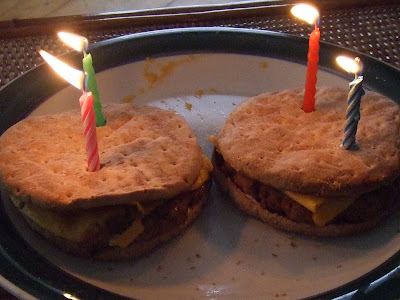 And yet, in that time, I have posted more recipes here on the blog than ever before. I’ve become a master of improvisation, searching out the ingredients I need and making the best of whatever I have. Tom and I even had to improvise on our birthdays: I found a vegan frozen blueberry pie that became Tom’s 46th birthday cake and since I’m not a huge fan of dessert, Tom made me a special birthday treat by sticking candles in one of my favorite breakfasts we like to call “McVegans.”