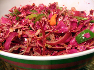 In a large bowl, mix sugar, 2 tbs water, vinegar and oil. Add cabbage, bell peppers and red onions. Salt and pepper to taste. Toss. Cover and let sit for about 30 min.