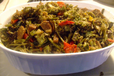 Remove the broccoli, asparagus and grape tomatoes from the oven and add them to the skillet. Toss the vegetables in the sauce. Add the spinach pasta and the Vegan sausage to the skillet and toss well until all ingredients are coated with the garlic and red pepper sauce.
