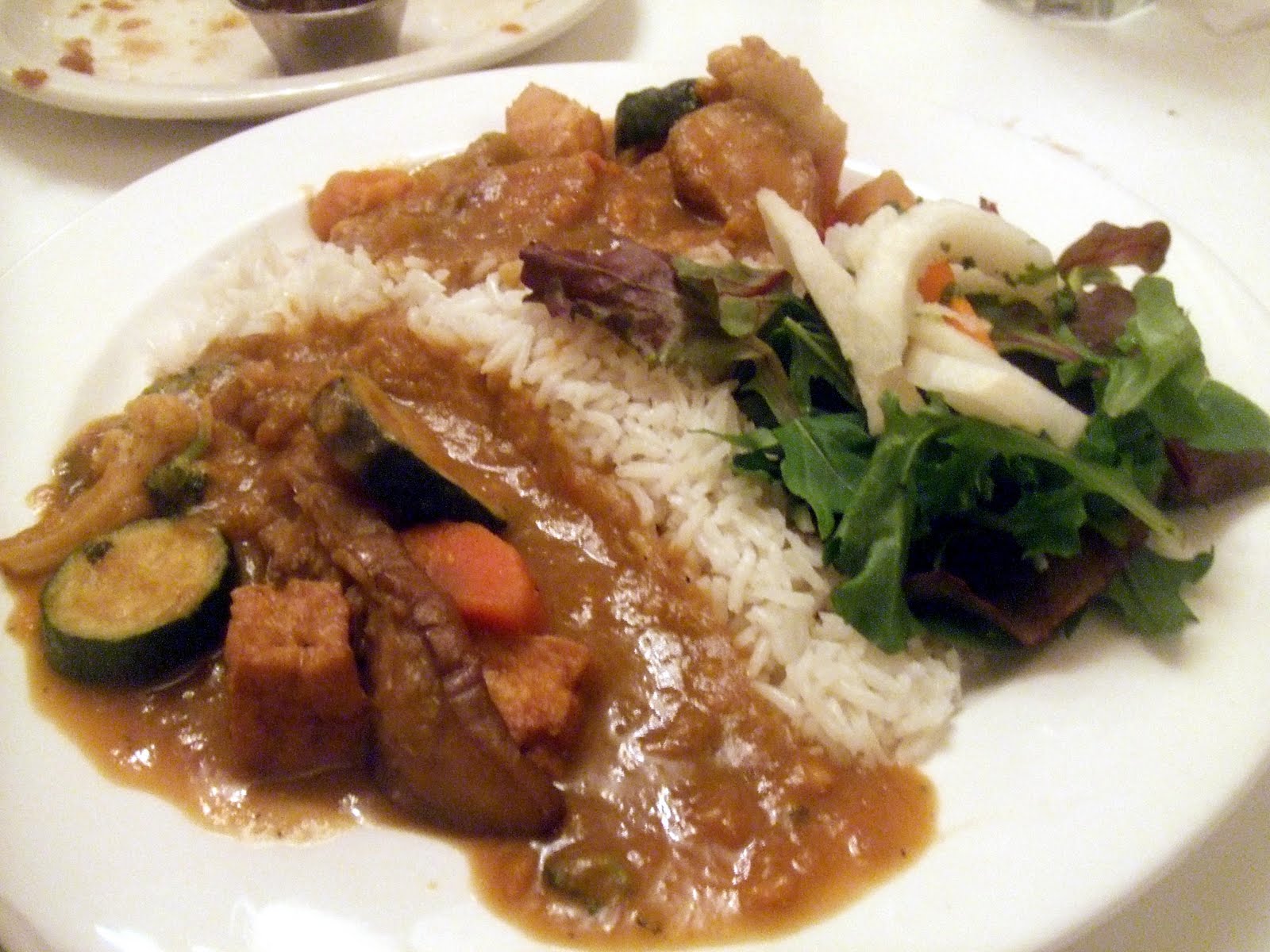 Our friend had another of the dinner specials – the Green Thai Curry ($12.50) which is “tofu and assorted vegetables with curry and coconut milk served with Indian basmati rice and jicama salad.” It was spicy and intensely flavorful. Once again, our plates went from bountiful to empty.