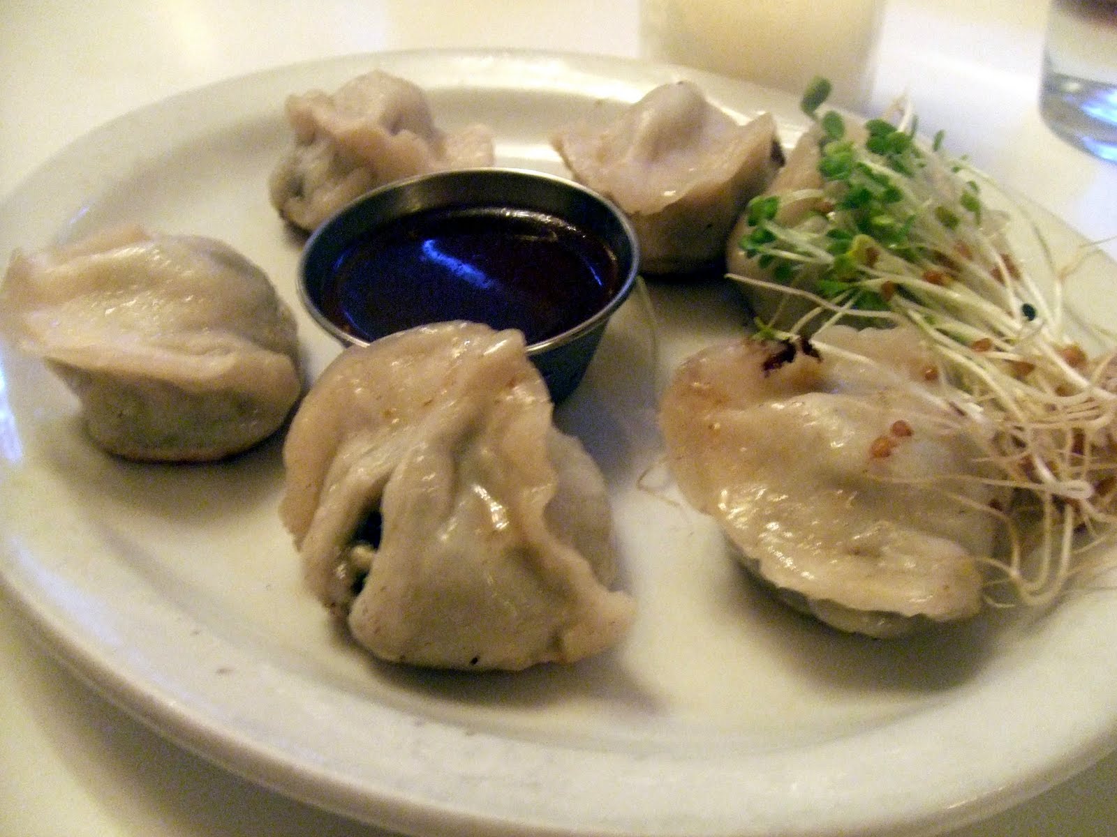 Our third appetizer was the Pan-Seared Shanghai-Style Dumplings ($7). They are “homemade dumplings filled with Chinese chives, shitake and wood-ear mushrooms, marinated tofu, and vegetarian protein served with a ginger balsamic dipping sauce.” The dumplings were delicious, generously filled with the delectable mushroom mixture. Our appetizer plates were empty in no time with only a lone sprout or two as evidence there was ever food on the plates.