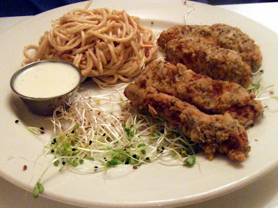 Anyway, after a long and repeated reading of the menu, we finally made our choices. Tom had one of the dinner specials – the combination PFC un-chicken basket with cold sesame noodles ($12.50). The un-chicken resembles fried chicken fingers and they were extremely yummy as were the noodles. Good comfort food minus the cruelty.