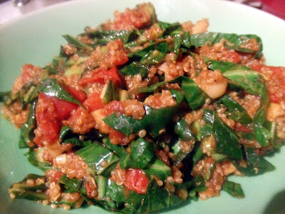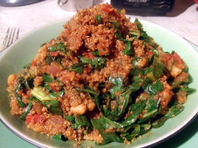 Add the tomatoes and cook for another 5 minutes until the tomatoes soften and break down. Mix in the quinoa and warm through. Add the greens and cook a few minutes until they are slightly wilted. If the pan dries out, add some water or broth.