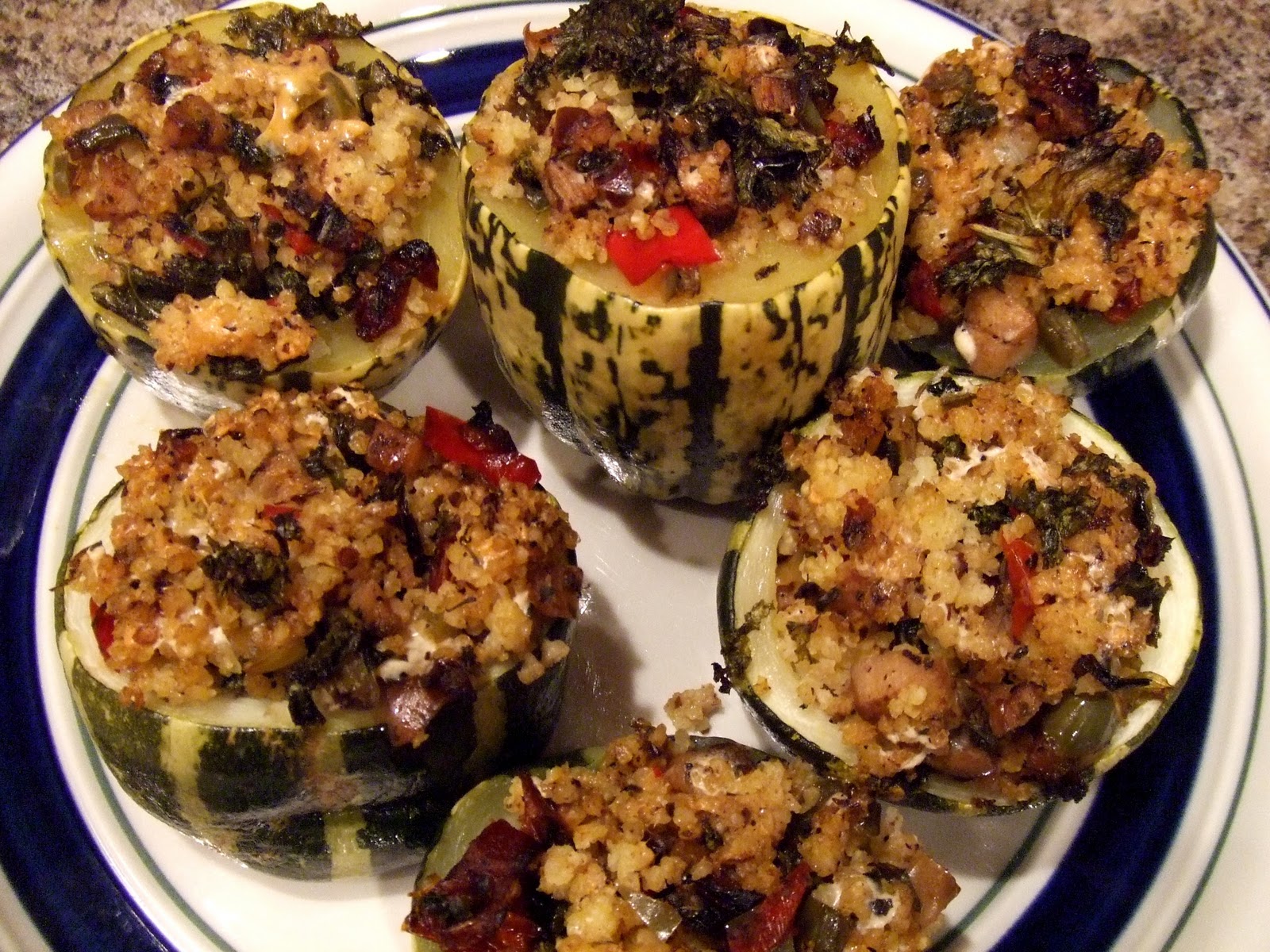 Put the squash halves into an oiled baking dish. Fill each squash with the stuffing. Pack it in and fill them generously. Cover the baking dish tightly with foil. Bake for about 1 hour until the squash is tender.