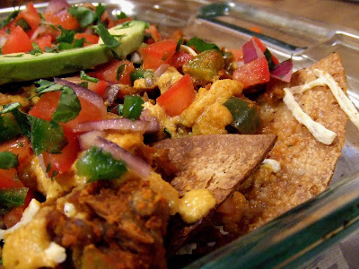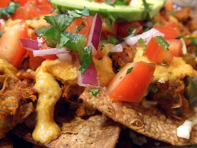 Now that we have all the components, let’s put them together to make a mountain of decadent but not sinful deliciousness. Here I used my own baked tortilla chips, Pico de gallo and Queso cheese sauce. I also added a bit of Daiya shreds and topped the nachos with fresh avocado slices instead of using guacamole. Remember, you don’t have to make your nachos the exact way I did. These are “nacho” nachos, these are mynachos (ok, I’m sorry but it had to be said sometime, didn’t it?) I purposely didn’t state any set amounts of the ingredients here. Use however much you want. Just remember to have as much fun making these as you have eating them!
